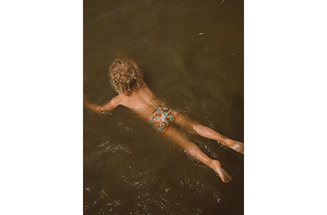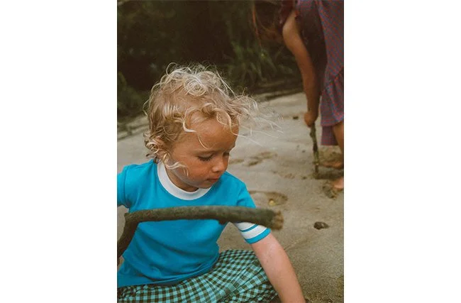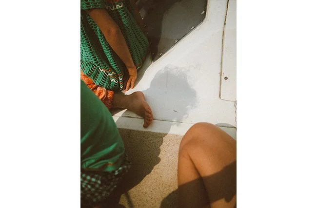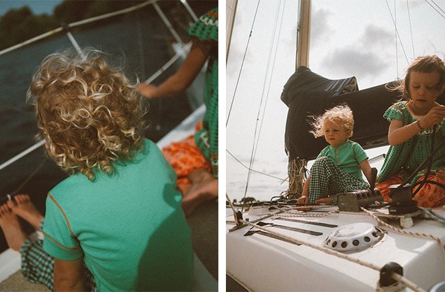 Photographer, friend, and collaborator, Natalia Horinkova, and her children, Amelia and Xavier, enjoy a day of sailing with their avô (grandfather) in Portugal for Misha & Puff Summer 23.